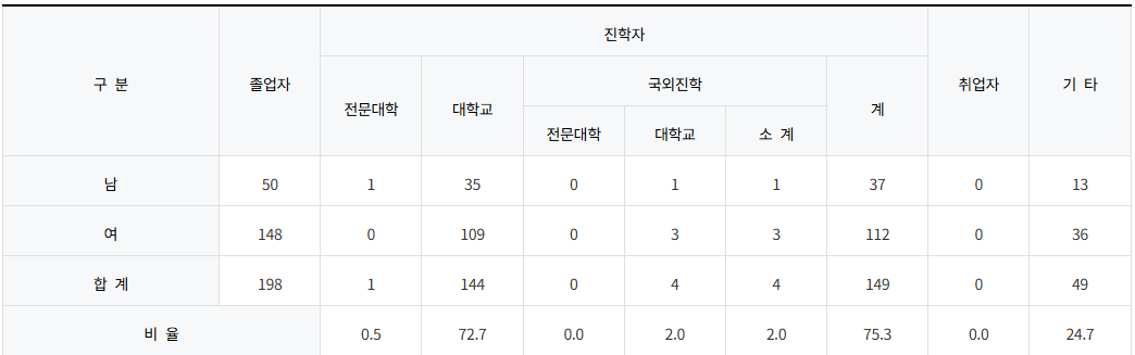 졸업생 198 명중 75.3 % 인 149 명이 국내외 대학으로 진학, 그 중 2.0% 인 4 명 해외대학 진학
