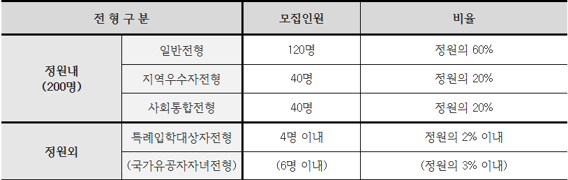 일반 전형 (120 명) + 지역우수자 전형(40 명) + 사회통합전형 (40 명)
