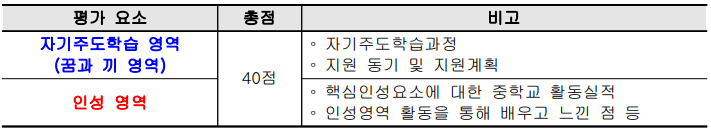◦ 핵심 인성요소에 대한 활동 실적 : 봉사체험활동을 포함한 배려, 나눔, 협력, 타인 존중, 규칙준수 등에 대한 중학교 활동 실적