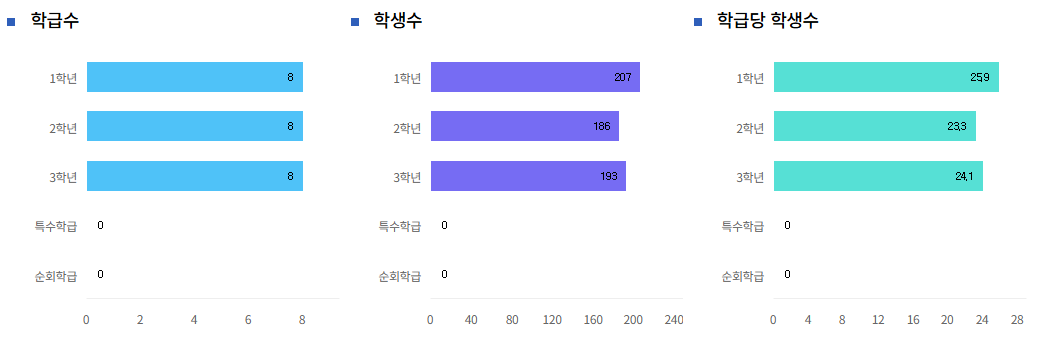 각학년 영어과 4학급, 일어과 2학급, 중국어과 2학급으로 총 8학급을 운영
