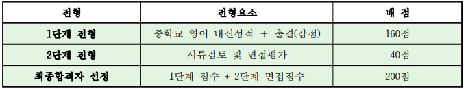 1. 영어 내신성적 (160점) : 중학교 2, 3학년 4개 학기 부여 점수의 합