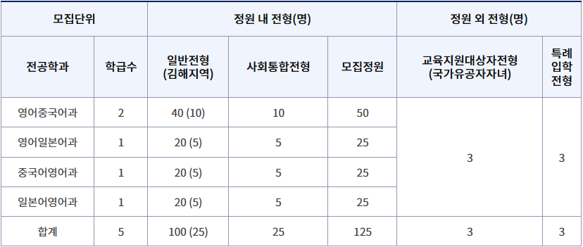 일반 전형 (100 명) + 사회통합 전형 (25 명)
