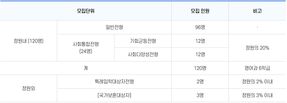 일반 전형 (96 명) + 사회통합 전형 (24 명)