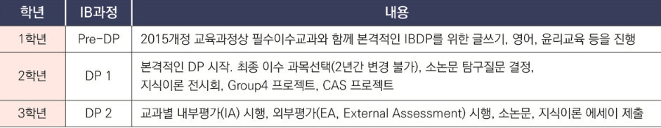 전국 공립고 중 최초로 IB 인증 받은 외고래요. 1학년 때는 '프리IB' 느낌으로 체험하고, 2학년부터는 본격적으로 IB 과정을 밟는 구조.