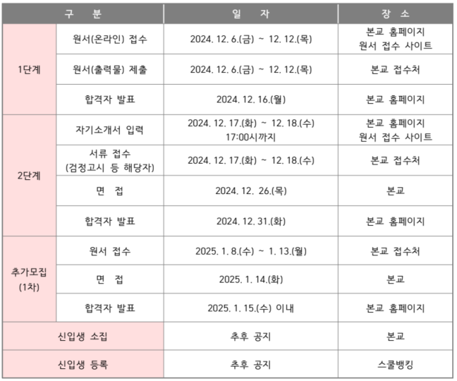 - 추가모집 원서접수 및 면접 : 1월 중순이내