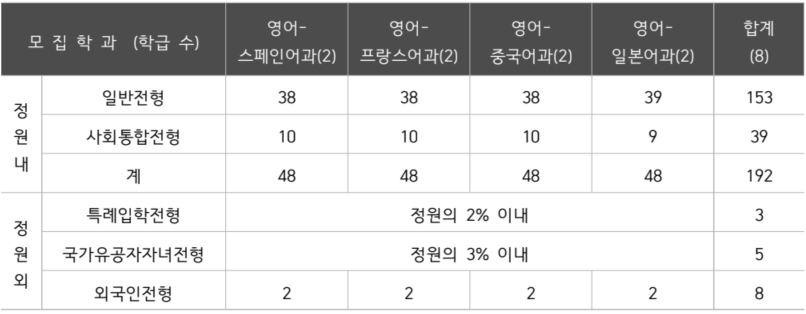 각 학년 영어스페인과, 영어프랑스과, 영어일본어과, 영어중국어과 2학급 총 8학급으로 구성