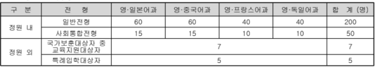 | 학과 | 영일본어과 | 영중국어과 | 영프랑스어과 | 영독일어과 |
