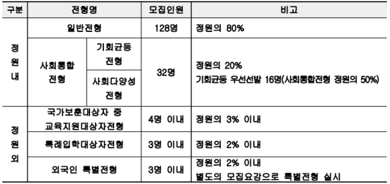 일반 전형 (128 명) + 사회통합전형 (32 명)
