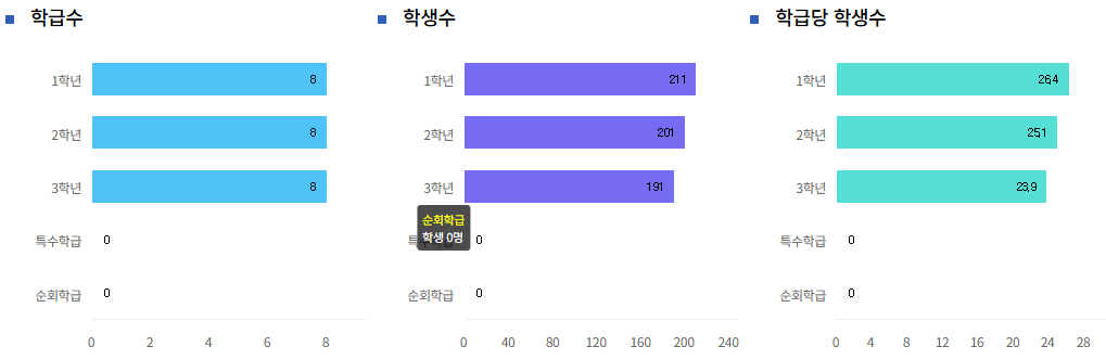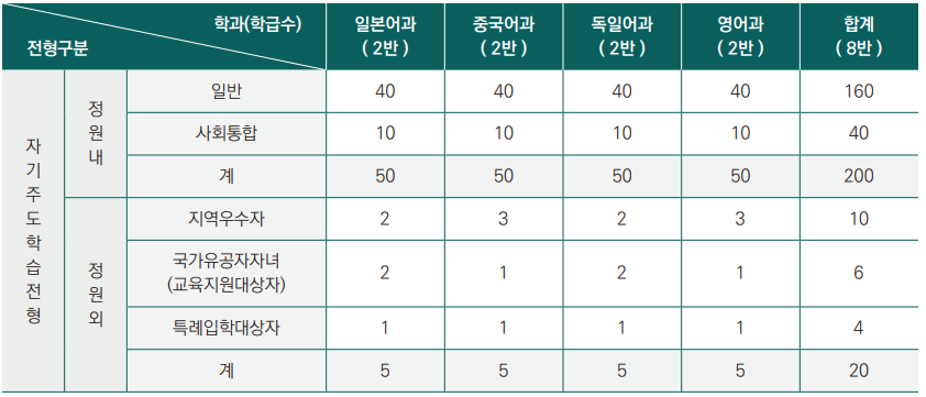 각 학년 영어과, 일본어과, 중국어과, 독일어과 2학급씩 총 8학급으로 구성