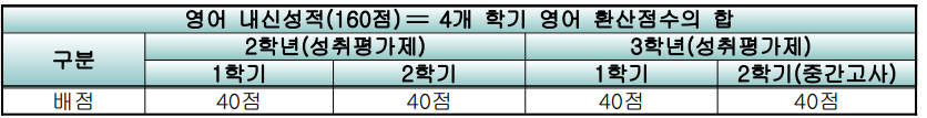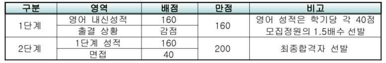 <1단계> 영어 내신성적(160점) + 출결상황(감점) 모집 정원의 1.5배 선발