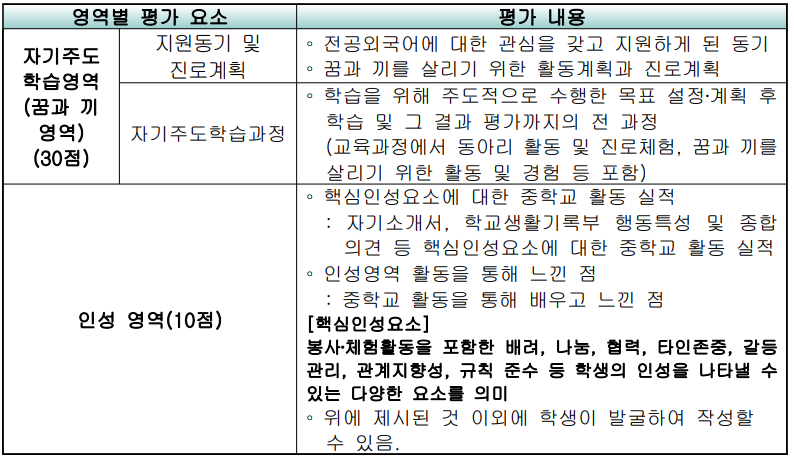 면접(40점) : 자기주도학습영역(30점) + 인성영역(10점)