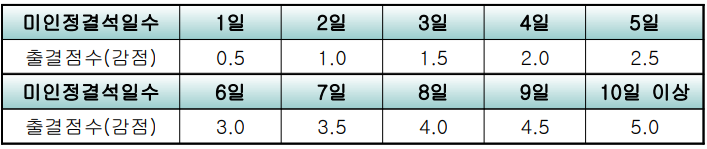 - (미인정 결석 일수 x 0.5점)을 1단계 총점 160점에서 감점